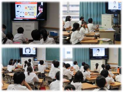 本日,7年生ではケータイ教室が行われました。リモートの形態で東京にいる講師の先生の話を聞きながら,いろいろな内容を学習していきます。