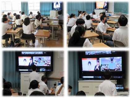 学習の流れの中では動画を見て「何が問題だと思いますか?」と問われる部分もあり,ごく短時間周りの人と意見交換をし,代表者が画面の向こうの講師の先生に向け考えを伝えていきます。