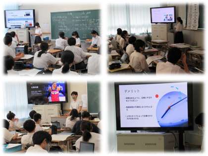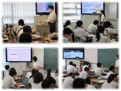 生徒たちはGIGA端末でパワーポイント(プレゼンテーションソフトウェア)を使って,効果的な発表に向けて準備を進めてきました。今日のみなさんの発表を見ていると,パワーポイントのスライドを上手に作っていますね。情報量や文字の大きさが適切で,色使いや図絵も効果的に取り入れ,見やすく仕上げています。またアニメーション機能やデザイナー機能をうまく使い,わかりやすくて楽しいスライドショウとなっていました。