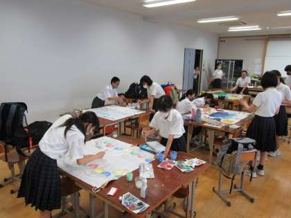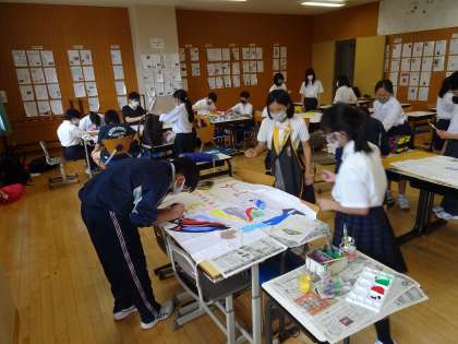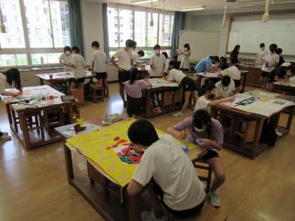 中学校では,個人懇談中の午後の時間を利用して,学級旗制作が行われています。これまでにデザインを募集してクラスで決定し,色使いを考えながら入れ替わり制作メンバーが作業に取り掛かっています。クラスのシンボルのお披露目が今から待ち遠しいですね。