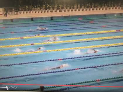 2つめの泳法,背泳ぎでは,リズムに乗った泳ぎで追い上げ,この組4位につけます。