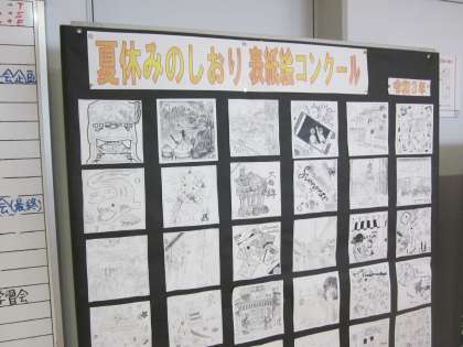 「夏休みのしおり 表紙絵コンクール」は,来年の夏休みのしおりの表紙絵のデザインを,生徒の皆さんから募集したものです。