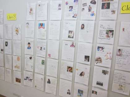 北棟5階のサブアリーナ前の通路には,7年英語科の学習成果が展示されています。