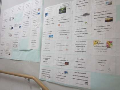 英語科では,「英語俳句」に取り組みました。俳句は,季語や五・七・五を基本としてつくりますが,今回,英語科では,そうした縛りはなく,自由な詩のイメージで取り組んだようです。自分の思いを適切に表す英文を考えている9年生の様子が目に浮かびます。
