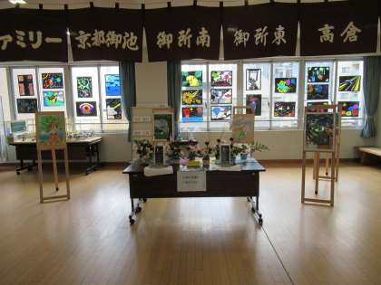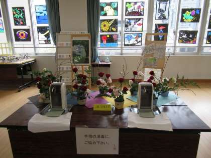 美術部の皆さんの作品はOikeフェスティバルに向けて制作されたもので,1組の皆さんのお花は先日の生け花教室でいけたものです。