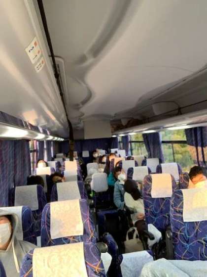 車窓から夕日がきれいに見えますが,生徒たちはかなりおつかれの様子です。ほとんどの生徒がぐっすり寝ていて静かなバス内です。