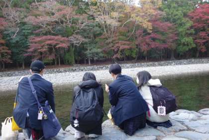 五十鈴川に手をつけて,穏やかな時間を過ごしている皆さんです。紅葉もきれいで,とてもいい景色です。