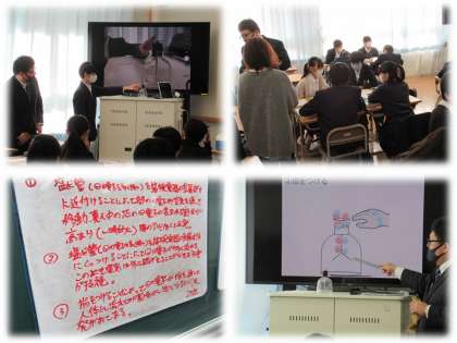 塩ビ管という水道管などに使われるパイプを布でこすり静電気を起こし,箔検電器に近づけると,中のアルミ箔が開きます。そのことを「電子」という言葉を使って説明する学習です。生徒の皆さんは記述力を意識しながら自分の考えを書き表し,友達の表現を参考に仕上げていきました。