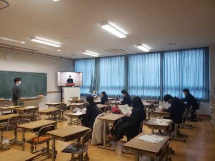本日6限,9年生では,明日の京都府公立高校中期選抜に向けての事前指導が行われました。校長先生からの激励の言葉と学年主任からの受検上の諸注意などを熱心に聞き入っていました。