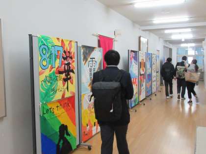 第1職員室前の廊下には,7,8年生の時の学級旗が掲示されていました。懐かしそうに目をやる9年生に,あの時の思い出がよみがえります。