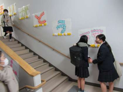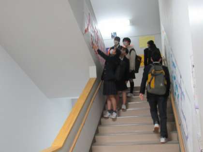 3階へ向かう階段に差し掛かると,8年生一人一人から9年生に送るメッセージシートで「人生はうつくしいみち」という言葉が描かれています。