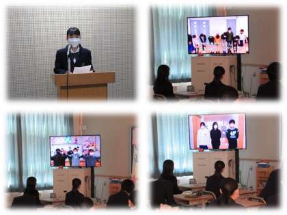 生徒会本部役員の司会進行のもと,校内テレビ放送を利用し,それぞれの教室で画面を通じてメッセージを伝えあうことになりました。とりわけ各学年からの映像メッセージはどれも見ごたえのある,思いのつまったものでした。