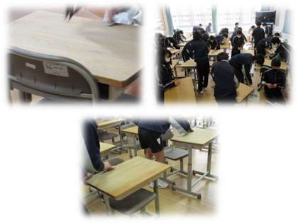 本日,7年では,生徒が行う作業の紙やすり掛けを行いました。7年生の教室を覗くと,体操服姿で,周りを古新聞で覆い,ひたすら紙やすりで天板をこする生徒の皆さんの姿がありました。