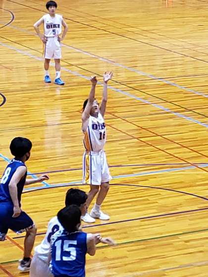 マークをかわしてNくんの3Pが決まり30−20,30−23までじりじり攻められますが,要所でキャプテンのKくんのシュートにまたもやNくんの3P,そして8年生のMくんの活躍で41−23まで差を広げ,43−25で前半折り返し。