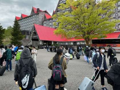 豪華な外装に生徒たちは興奮気味。夜になるとライトアップされてもっと幻想的な雰囲気になるとか・・。