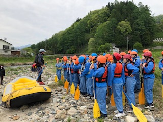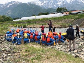 4〜7組は,姫川に到着し,クラス写真を撮った後,インストラクターさんからラフティングの説明を聞いています。
