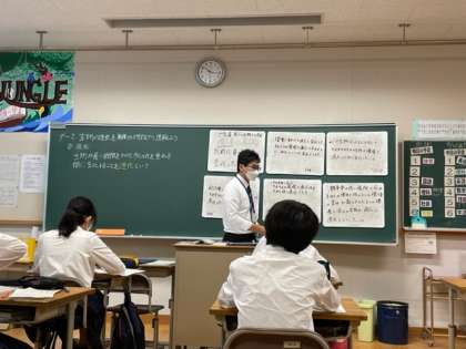9年生の理科「進化」の授業です。指導教官の先生のアドバイスのもとで、生徒たちが下校した後に、見えないところで授業の練習もして努力をしています。本日の本番も緊張しながらでしたが、一生懸命が伝わったのか、生徒は楽しそうに興味深く授業に取り組めていました。