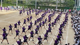 そして,フィナーレを飾るのは9年生の団体演技「京炎そでふれ」です。京都御池中学校のオリジナルの鮮やかな法被に身を包み,最高学年らしい迫力のある踊りと掛け声で,見事な演技を見せてくれました。「京炎そでふれ」は,京都御池創生館で学ぶ全ての学年が参観しました。参観した児童・生徒達は迫力ある踊りを間近で見ることができ,9年生のこれまでの努力を改めて感じることができました。
