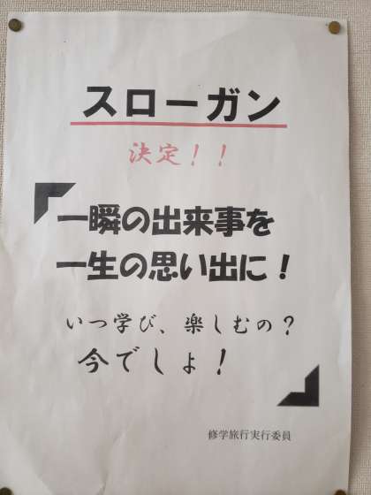 廊下にはスローガンなどの掲示物もあり、ムードが高まっています。事前学習を深めて、現地での学習が充実できるようにしていきましょう。