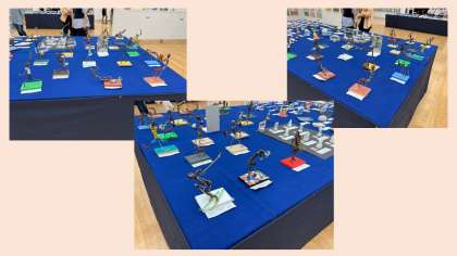 「一瞬を捉える」というテーマで、様々な一瞬の動きを針金によって表現し制作した8年生の作品です。また、7年生のHさんの靴のデッサンが、交歓作品に選出されました。