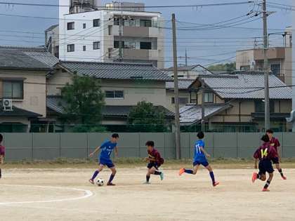 前半は互いに一進一退の攻守が目まぐるしく変わるなか、集中して戦い引き分けのまま前半終了。後半に入り、相手は作戦を変え、ボールを左右に振って、隙間を作ろうとしますが、全員が声を出し、集中してプレイエリアを確認しながらしっかりと守りました。7分、相手選手に詰寄り、ボールを奪った8年Tくんがそのままゴールまでドリブル突破先制点を獲ります。その後、コーナーキックからヘディングを合わされ同点。さらに相手コーナーキックをクリアした先に相手選手がいてミドルシュートを決められ逆転。残念ながら1−2で敗れてしまいました。