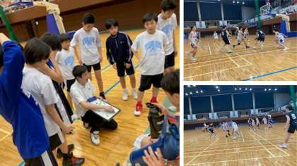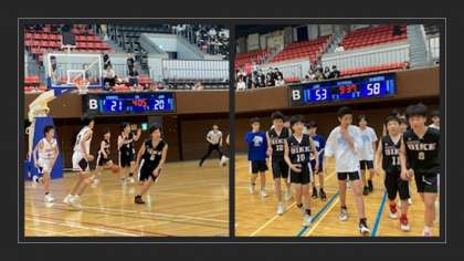 とても悔しい敗戦でしたが、落ち込んでいる時間はありません。1試合を挟んで,今度は準々決勝で敗れた4校が戦う5位決定戦のトーナメントが始まりました。「絶対に勝つぞ」と気持ちを高めて挑む相手はY中学校。この試合もはじめは先行される展開でしたが、連続でシュートを決めて第1ピリオドは14対10。シュートを続けて決めても、Y中学校も得点を取り返して追いかけてきます。第4ピリオドでは一時は逆転を許しましたが、終盤には応援と一体となって得点を重ね、58対53と見事に勝ち切ることができました。明日、5/5の試合も勝ち切って,5位入賞を目指します。