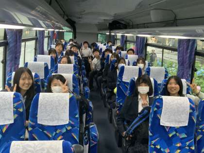 保護者の方々や「9年生、気をつけて行ってきてね〜」「楽しんできてね〜♡」と7・8年生の先生方のメッセージボードに見送られての出発でした。