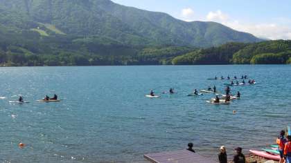 サップ&カヤックの様子です。水面が太陽に揺れて、大自然の中で素晴らしい体験活動をさせてもらっています。