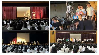 9年生は、「修学旅行での学びを発表」ということで、ストーリー性のある劇の中で、クイズを行ったり、会場の周りを移動しながら劇をしたりするなど、さすが9年生といった、観る者を惹きつける発表でした。