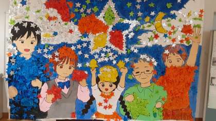 おいけあした保育園の園児から、6年生、7年生、8年生、9年生全員が、折り紙で折った自分の一等星をタペストリーに貼って作り上げました。Oikeフェスティバルのスローガン「一等星」〜空で最も輝く一等星のように、御池ファミリー全員が輝き合い、絆を深めよう!〜を表現した合同作品。お越しの際には、ぜひ、観て帰っていただきたいと思います。
