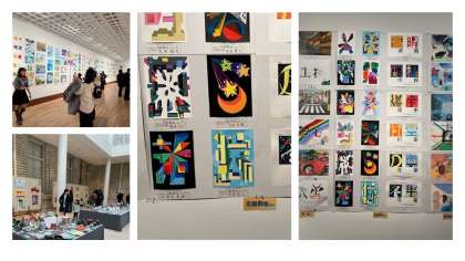 今回、7年生は「絵文字」、8年生は「立体作品」、9年生は「一点透視図法を使った色彩構成」をそれぞれ出品しました。