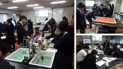 80分間の実験室での学習では、物理「しょうとつのエキスパートに君はなる!」・化学「つくって学ぼう あわパワー!」・生物「植物のメッセージ」・地学「Re:Bone」のテーマで、それぞれのクラスに分かれて学習をしました。どのクラスも科学センターならではの教材が準備されており、理科の本質に触れることができた授業でした。