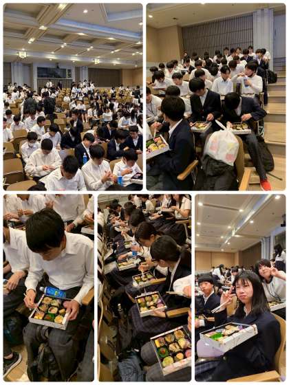 記念公園の広場で昼食の予定でしたが、雨がぱらつき始めたので、メモリアルホールを借りて昼食をとりました。
