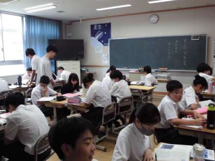 故事成語は日々の生活に根付いていますが、もともと中国の故事に由来するものも多くあります。今回は、その故事を漢文で読んでみるために、訓読文について学ぶ時間です。漢文を読み解けるように日本で作られた様々な工夫について学んでいますが、慣れるまでは難しかったりするものです。グループの友達と一緒に学んだり、担当の説明を聞きながら生徒たちは懸命に理解して活用できるようにしようとしていました。今後も楽しんで漢文を読んだり味わったりしてほしいと思います。