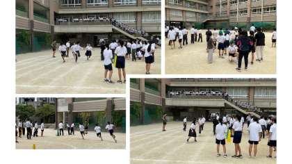 また、本校はグラウンドを囲んで校舎がコの字になっているので、校舎の窓からもたくさんの生徒が注目して、その練習を見守っていました。