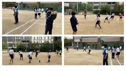 はじめに、自分のチームの課題を話し合う時間がありました。生徒たちはとても活発に、前回の授業を振り返って課題を出し合い、今日はこのようにしようという目標を立てて、話し合いをしていました。その後チームの目標に応じた練習をチームごとに行っていました。練習の姿を自分たちでiPadに動画で収め、確認しながら練習をしていました。どのグループも仲が良い様子が見てとれ、とても良い雰囲気でした。