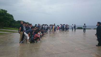 小雨が降る中,平和祈念公園で『平和セレモニー』を行いました。群読の後,みんなで作った『千羽鶴』を平和の礎に捧げました。傘を差しながらのセレモニーとなりましたが,それぞれに感じるものがあったのではないでしょうか。