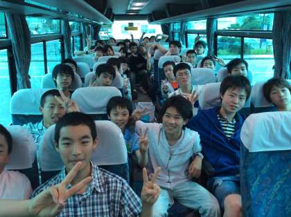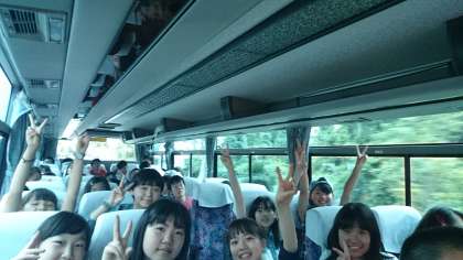 道の駅かでなを出発し,名護市のホテルに向かっています。お天気は雨がやんで,くもり空のようです。でもバスの中は笑顔満開!! みんな元気そうですよ。