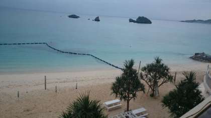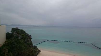 ホテルの窓から見た風景です。青く澄んだ海の色! 晴れていればもっと素晴らしいのに!!! と少し残念な気もしますが・・・ みんな元気に朝を迎えられたとのこと。そのパワーで曇り空を吹き飛ばしてほしいですね。