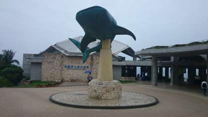 あいにくの雨模様ですが,美ら海水族館に到着しました。晴れていれば,この後に行く伊江島が見えるのですが,残念ながらかすんでいるようです。