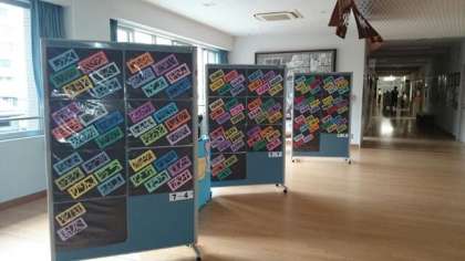 7年生が入学後,美術の時間に取り組んできた「切り絵文字」が完成しました。一人一人の作品が昇降口に展示されていますので,学校へご来校の際はぜひ見ていただければと思います。