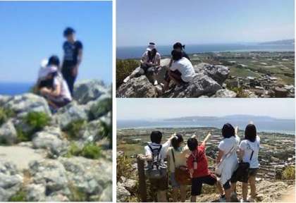 城山の山頂にて記念撮影。半分くらいの生徒が登りました。