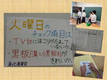 今日から3日間,美化委員会が企画した美化コンテストを実施します。17日に行う夏休み前の大掃除に向けて,今まで使った教室をきれいにしようというみんなの気持ちを高めていくことを目的に取り組みます。各曜日担当の美化委員が,自分たちで決めたチェック項目を点検し,点数をつけていきます。初日の今日は,どのクラスも高得点を狙って掃除を頑張っていましたが,美化委員の厳しいチェックが入っていたようです。力を合わせて掃除をする中で,みんながさわやかな気持ちになるといいですね。