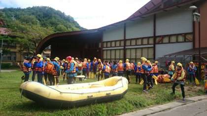 9年生の約半分,120名余りの生徒が,いよいよこれからラフティングに挑戦です。ライフジャケットを身に付け,ボートを前にまずは講習会。日頃はインターネットやゲームなどバーチャルな世界を体験していることが多い子ども達ですが,『大自然』を全身で体感してほしいですね。現地では太陽も顔を出しているそうです。今日のところは,『雨雲』は京都で引き受けておきましょう。