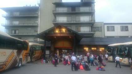 17時30分頃,予定よりも少し早く,2日めの宿「黒部ビューホテル」に到着しました。体験を終えてバスに乗り込んだときには,疲れた表情も見せていましたが,さすがに若い! 大きな荷物を手に明るく笑顔でホテルへと入っていきました。