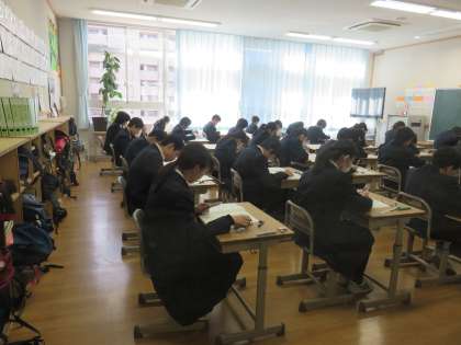 昨日から定期テスト5が始まっています。本日,7年生は「国語・社会・音楽」,8年生は「数学・音楽・社会」の3教科が行われました。子どもたちは全力でテストに取り組んでいました。明日は,テストの最終日です。7年生は「保健体育・英語・美術」,8年生は「国語・理科・美術」の3教科です。体調を整えて明日のテストにのぞみましょう。