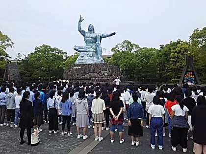 平和セレモニーは実行委員会の学習部が中心となって行われました。各クラス毎に伝えたいメッセージを群読した後,全員で『ぜんぶ』という曲を合唱しました。「大切なことは ぜんぶここにある。泣くこと 笑うこと 怒ること 喜ぶこと あたりまえの気持ちは あたりまえのものとして そのまま 今ここにある・・・」という,さくらももこ作詞,相澤直人作曲の合唱曲です。子ども達は,平和祈念像を前にしてこの曲を歌うことで,平和への思いを強くしたのではないでしょうか。私たちも京都の地で,子ども達が歌っている姿を想像しながら,しばし平和について考えてみようと思います。この曲は,9月に行われる合唱コンクールの学年合唱でも歌う予定だそうです。この地で感じた思いを是非とも,後輩達に伝えてほしいと思います。