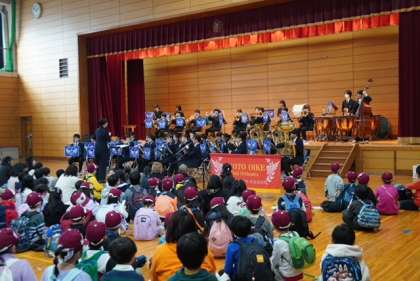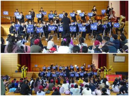 たくさんの小学生や保護者の方々、地域の方々が観に来てくださり、会場の体育館内は熱気にあふれていました。なじみのある曲を演出を交えながら披露し、会場からは自然と手拍子が沸き起こり、大いに盛り上がりました。