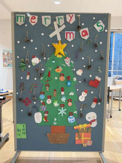大きなツリーにはそれぞれオーナメントを描いて飾りつけたり、サンタやトナカイのイラストを描いたり、松ぼっくりを使った装飾を作ったりと、昇降口をにぎやかに彩る掲示物を作り上げることができました。