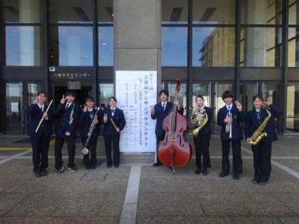 12月20日(土)、八幡市文化センター大ホールで行われた京都府アンサンブルコンテストに、吹奏楽部の8年生部員8名(フルートKさん・クラリネットKさん・バスクラリネットEさん・アルトサックスHさん・トランペットIさん・ホルンMさん・コントラバスIさん・パーカッションYさん)が管弦打8重奏で出場し、銀賞を受賞しました。